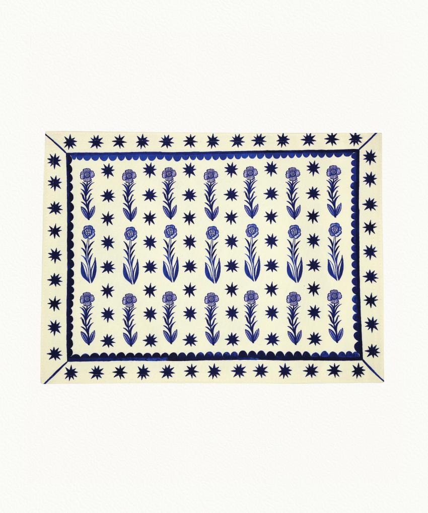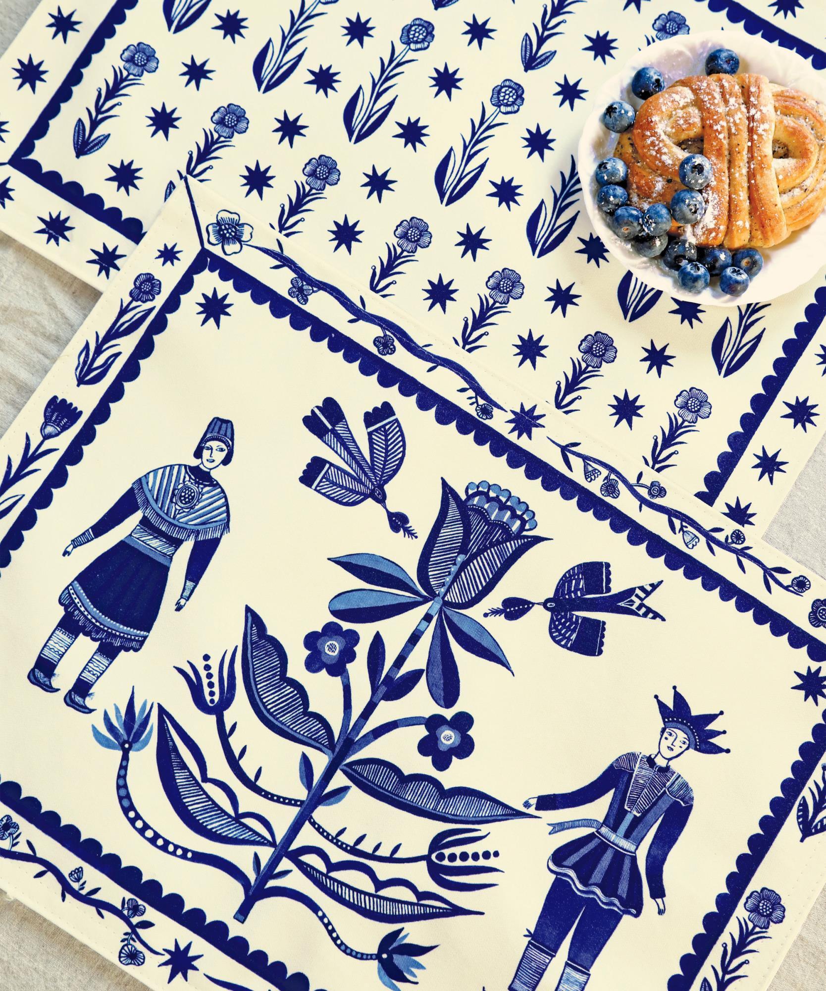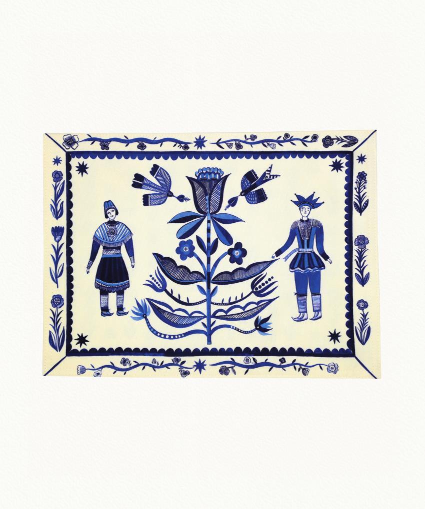 Wir haben uns von Skandinavien und den Samen, einem indigenen Volk in Lappland, seiner Folklore und seinen Märchen zu dieser Winterkollektion inspirieren lassen. Dieses wendbare beige-blaue Tischset zeigt auf der einen Seite samische Figuren, die von Blumen und Vögeln umgeben sind, und auf der anderen Seite unzählige Blumen und Sterne.
