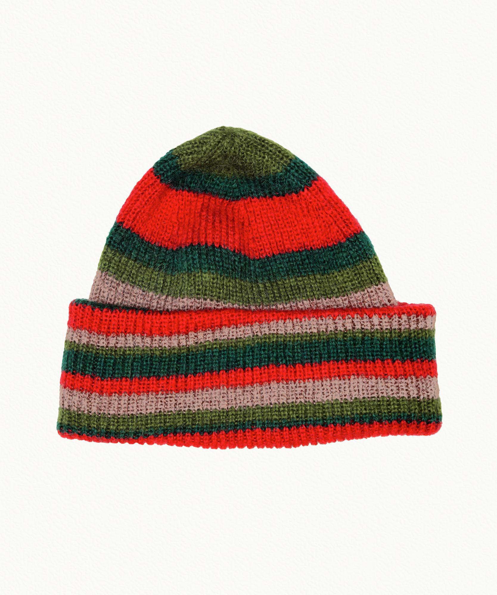 Diese Strickmütze verleiht jedem Outfit eine fröhliche Note. Durch die dynamischen orangefarbenen Streifen bekommt das Grün neue Energie und bringt das Gesicht elegant zur Geltung. Diese Damen- und Herrenmütze mit nicht genähtem Umschlag passt zu den langen Fäustlingen, zu Mänteln und Daunenjacken und gibt Ihrem Look eine Menge Pep.