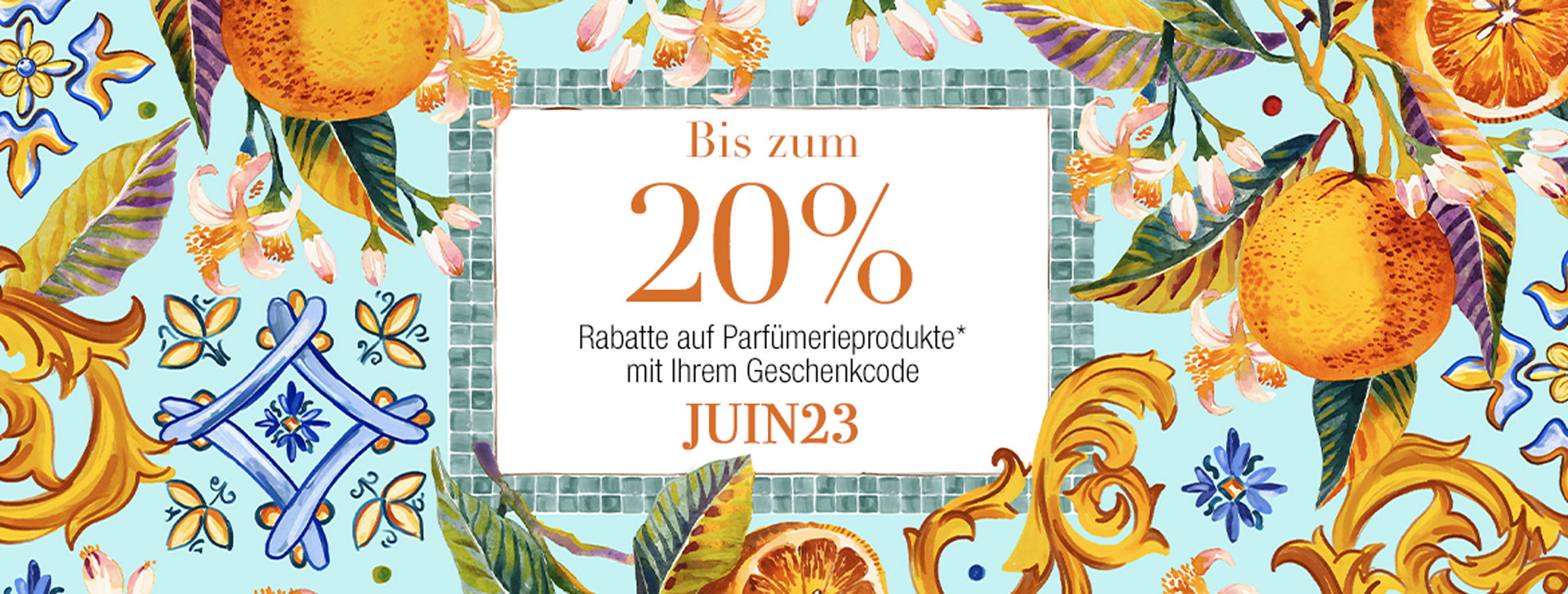 *Gültig solange der Vorrat reicht, für Bestellungen auf www.fragonard.com vom 01.06.2023 bis 30.06.2023 und nur, wenn Sie JUIN23 im Warenkorb eingeben und bestätigen (bevor Sie die Versandkosten hinzufügen). Angebot: 5% Rabatt auf Nachüllflasche aus Aluminium (600 ml), Duschgels und Körpermilch, After-Shave Balsam, Seifen, Seifenschalen und Sets (Seife + Seifenschale). 10% Rabatt auf Eau de Toilette (50, 100 und 200 ml), Eau de Parfum (50 ml), Kerzen und Diffusoren, Kosmetika und Seifen der Serie "Vrai", Essentielle Pflegeprodukte und Eaux de Maison. 20% Rabatt auf Parfüms (15, 30, 60 und 120 ml). Gilt nur für eine Lieferung per Standardversand in die auf unserer Website lieferbaren Länder. Gilt nicht für Bestellungen, die per Telefon oder Post aufgegeben werden, und nicht in unseren Fabriken und Geschäften. Gilt nicht für Workshops "Parfümeurlehrling" und Konferenzen. Nicht mit einer anderen Werbeaktion kombinierbar. Sie können für dieselbe Bestellung nicht die Geschenke von zwei verschiedenen Bestellscheinen oder Newslettern erhalten. Nicht gültig für bereits bestätigte, versandte oder in Vorbereitung befindliche Bestellungen. Persönliches Angebot, nicht übertragbar, nicht abtretbar und nur einmal gültig. Gültig für alle Kunden, die vor dem 31.05.2023 in die Datei Fernverkauf aufgenommen wurden.