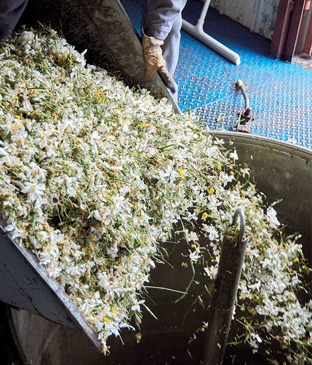 Narcissus picking on Aubrac plateau (a volcanic and granitic plateau located in the south-central part of the Massif Central) is an ancient springtime tradition that continues to unite the local population. The flowers were gathered by hand in the 1950s, but the task became easier with the advent of various tools. Today, the « trolley » technique is favored by independent pickers as the trolley is easy to manufacture and can significantly increase yields, up to 100 to 200 kilos per day. The weighing technique is rustic yet resolutely here to stay - it is performed using Roman scales which “have never broken down and are never wrong”.