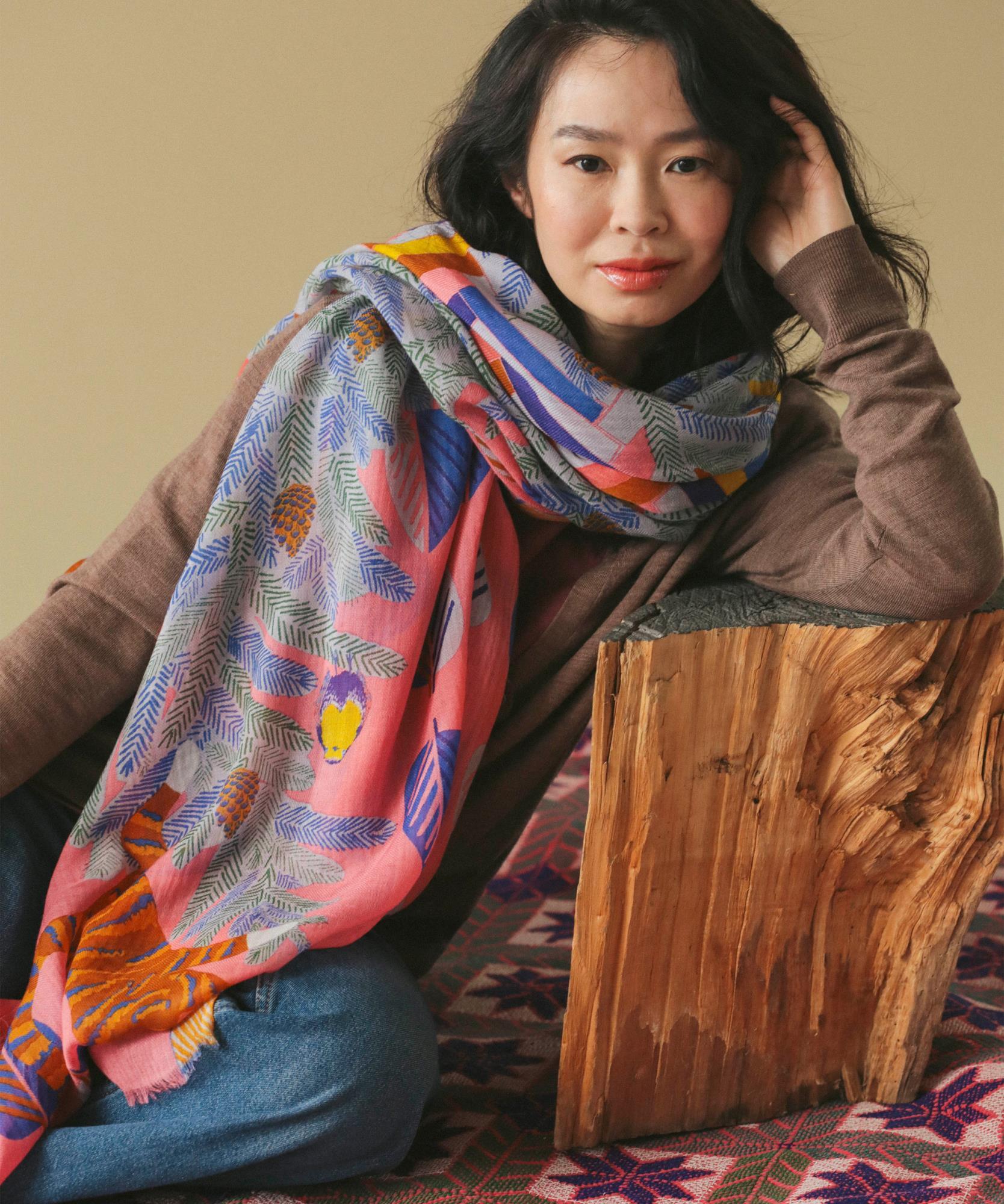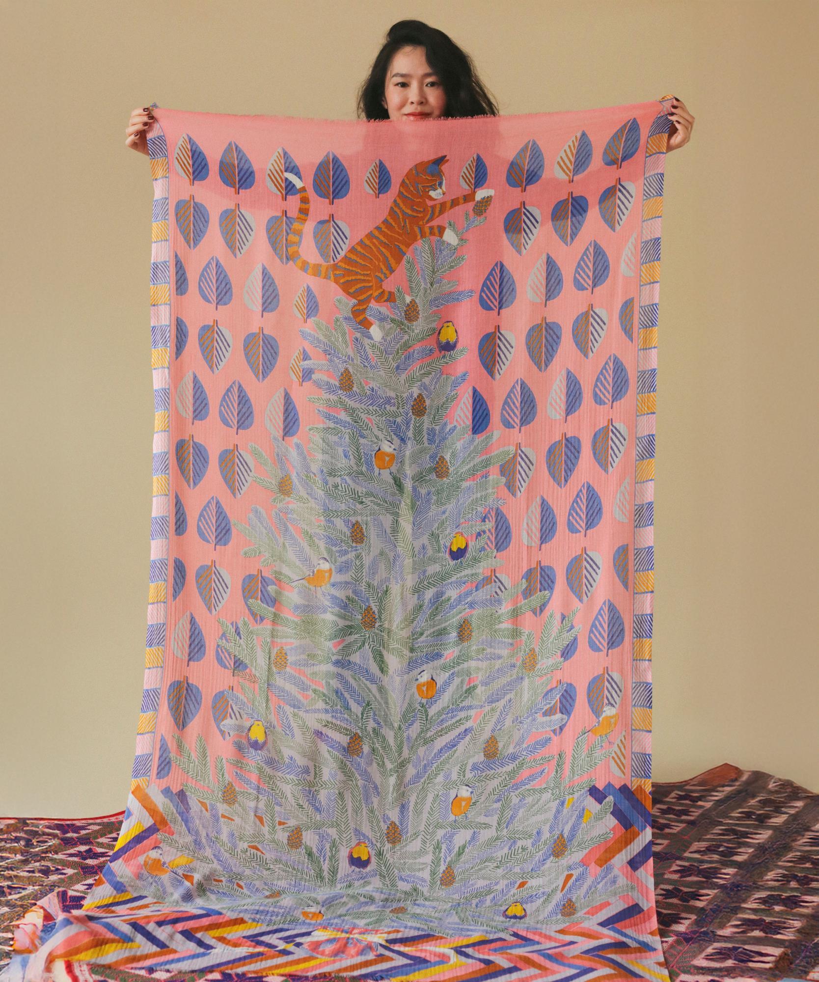 When tied, this colourful woollen shawl appears to be adorned with an abstract design, but when unfolded it reveals a sweet, humorous motif. Against a bright pink background punctuated with blue foliage, a curious little cat climbs to the top of a stylised fir tree, encountering chickadees and pine cones along the way. Wrapped around the neck or draped over the shoulders, this large pure wool shawl (100 x 200 cm) with its flowing design and lightly fringed edges adds a cheerful, cosy touch to all your outfits.