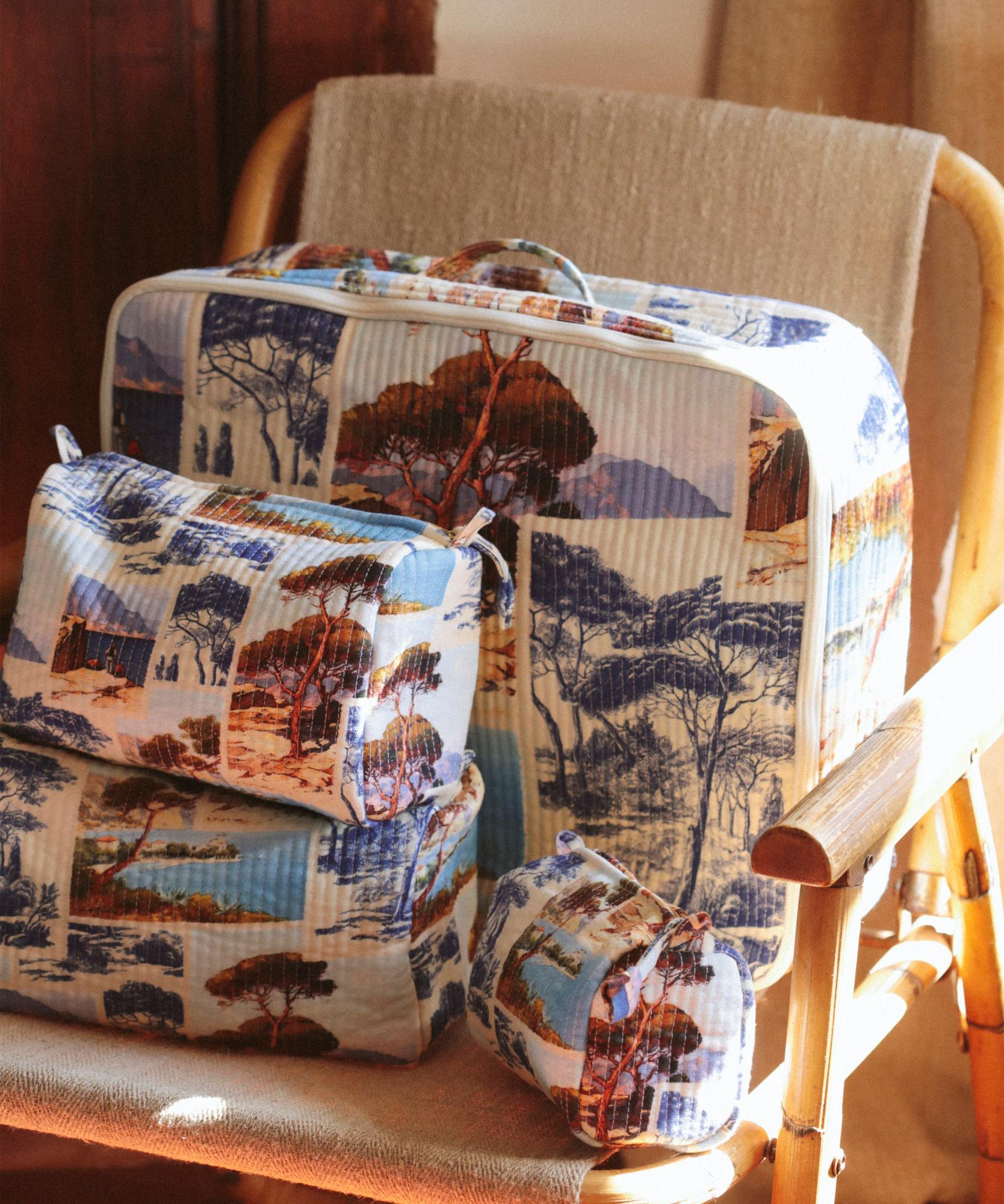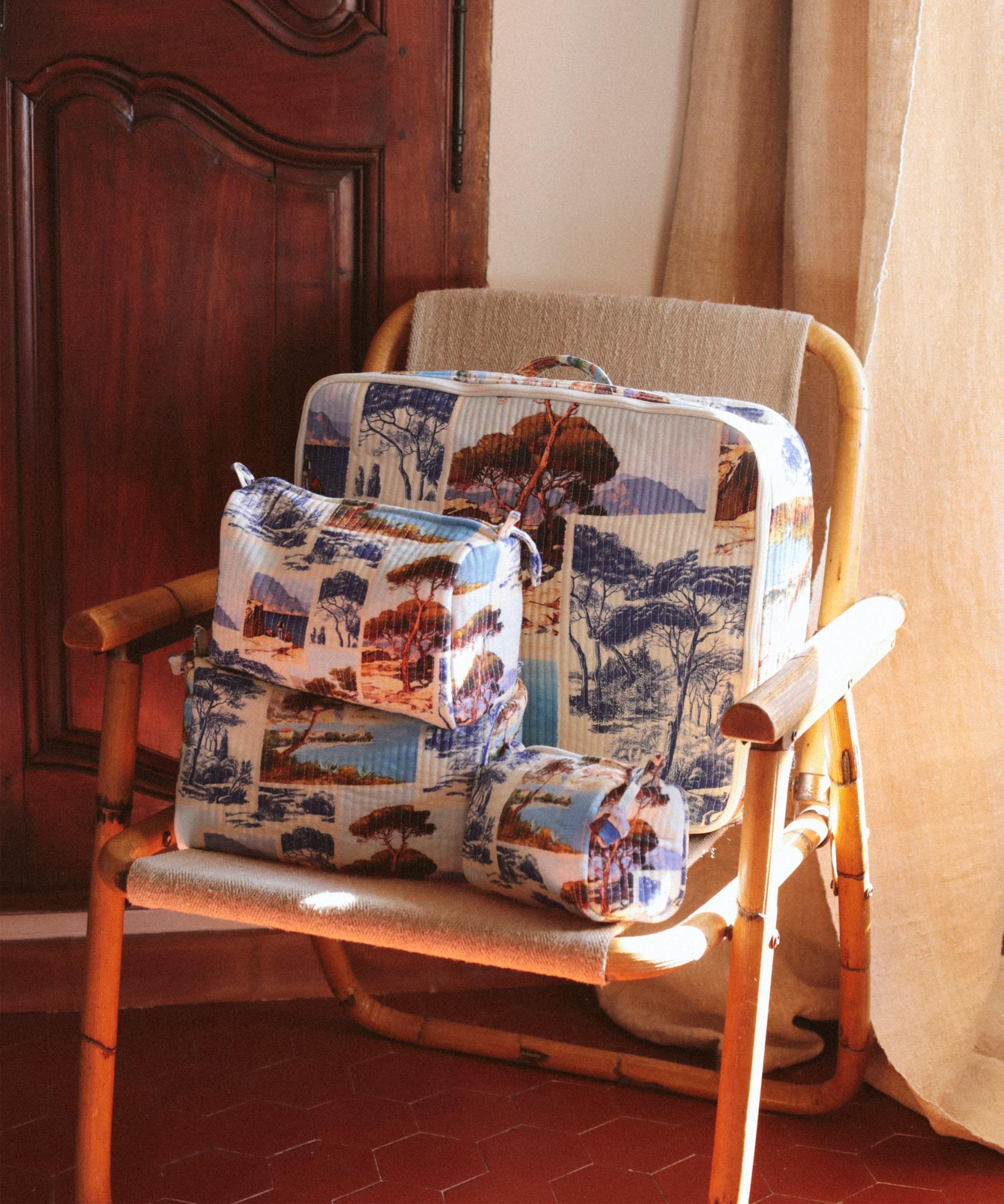 Soft and hard-wearing, this small quilted and zipped toiletry bag combines a cotton exterior with a water-repellent nylon interior: ideal for keeping your beauty essentials safe, and easy to keep clean. The summery Calanques print will take you on a getaway. Available in two sizes to suit all your needs, whether you're staying home or setting off on a journey.
