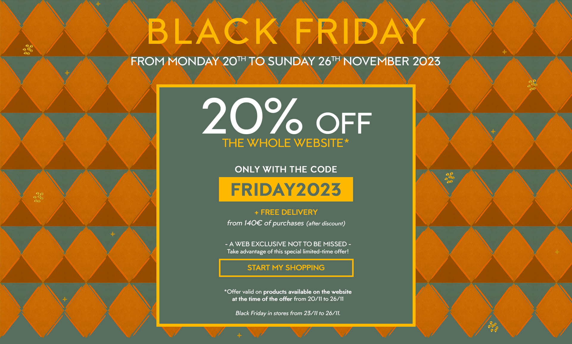 *Offer valid on products available on the website at the time of the offer: The Perfumery, Fashion, and Lifestyle. Excluding gift wrapping, ongoing promotions, clearance items, and products out of stock on the internet at the time of the offer. Within the available stock, valid for orders placed on www.fragonard.com from 20/11/2023 to 26/11/2023, and only by entering and validating FRIDAY2023 in the cart (before adding shipping costs). Valid only for standard delivery in the countries available on our website. Not valid for orders placed by phone and mail, and not valid in our factories and shops. Not valid for the purchase of an E-gift card. The purchase of an e-gift card is not part of the Fragonard loyalty program and does not allow the accumulation of loyalty points. An e-gift card purchased in Euros cannot be sent in the USA and is not valid on the dedicated US site. Not applicable for "Apprenti Parfumeur" workshops and conferences. Not cumulative with another promotion. You cannot, for the same order, receive the gifts relating to two different order forms or newsletters. The offer is personal and cannot be transferred or assigned. It can only be used once. Not valid for orders already validated, sent or being prepared. The data collected using this form will be processed by the relevant departments of Les Parfumeries Fragonard, a company registered in the Grasse Commercial Register under number 403 394 018. Your data is collected and used to send you our latest product news by email. Your data will be kept for a maximum period of 3 years after your last response to our requests. The legal basis for processing is your consent, which you may withdraw at any time, without prejudice to the lawfulness of any processing completed before this withdrawal. Pursuant to the General Data Protection Regulation 2016/679 of 27 April 2016, you have the right to ask LesParfumeries Fragonard for access, rectification,portability and/or erasure of your personal data, as well as to restrict and/or object to its processing. You also have the right to file a claim with CNIL at https://www.cnil.fr/. To exercise your rights with Les Parfumeries Fragonard, write to LES PARFUMERIES FRAGONARD - MailOrder Department - 20 boulevard Fragonard - 06131 GRASSE - FRANCE, or send us an email at: privacy@fragonard.com