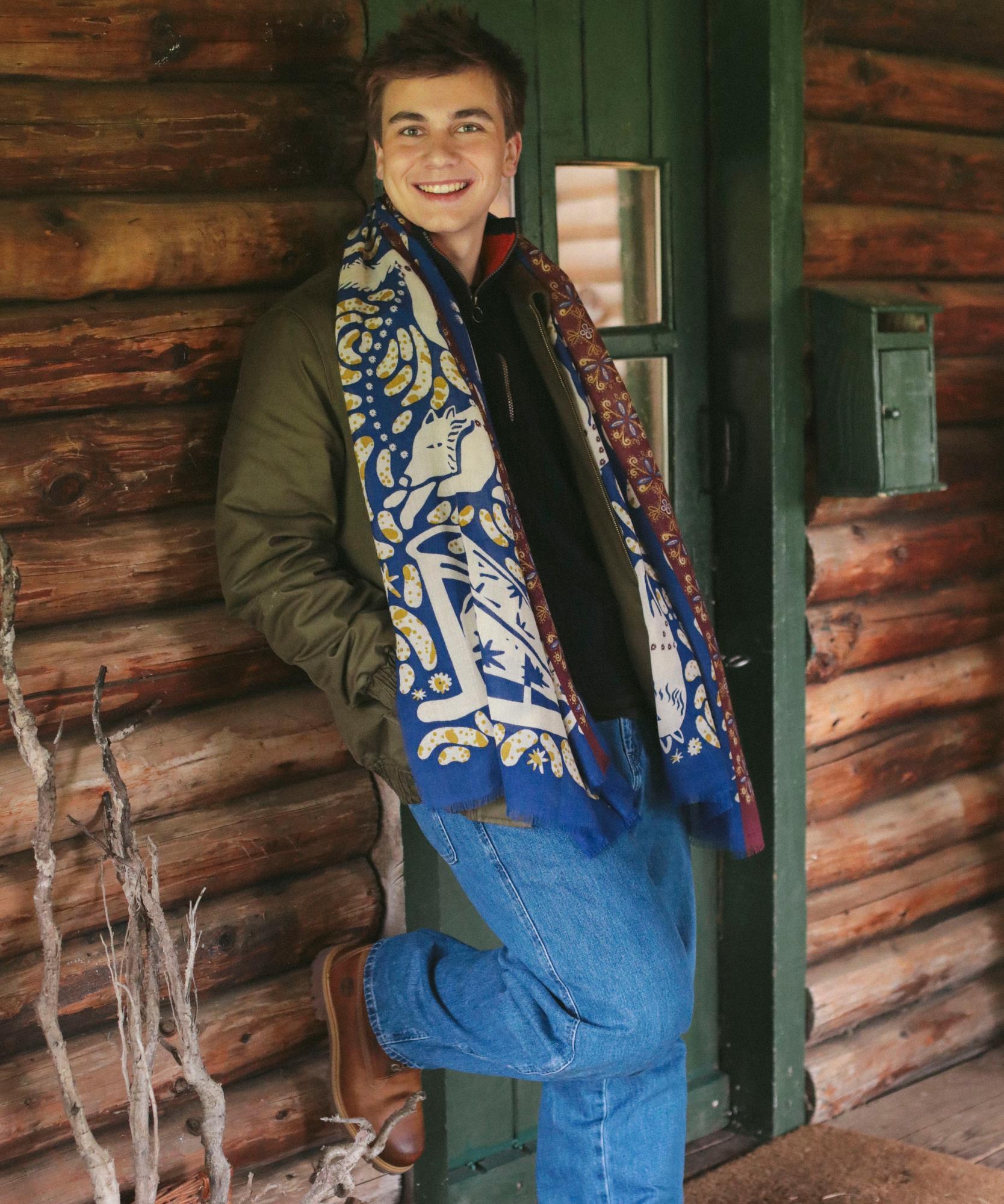 A friendly pack of stylised sled dogs adorns this large, soft woollen shawl. Instad of collars and harnesses? Flowers! With this cheerful print, our House takes you to Lapland: an invitation to wrap yourself in this soft, generous shawl (85 x 180 cm) watching the snowflakes softly fall. This blue and ecru shawl with bright yellow accents is a wonderful accessory to treasure or to give as a gift.