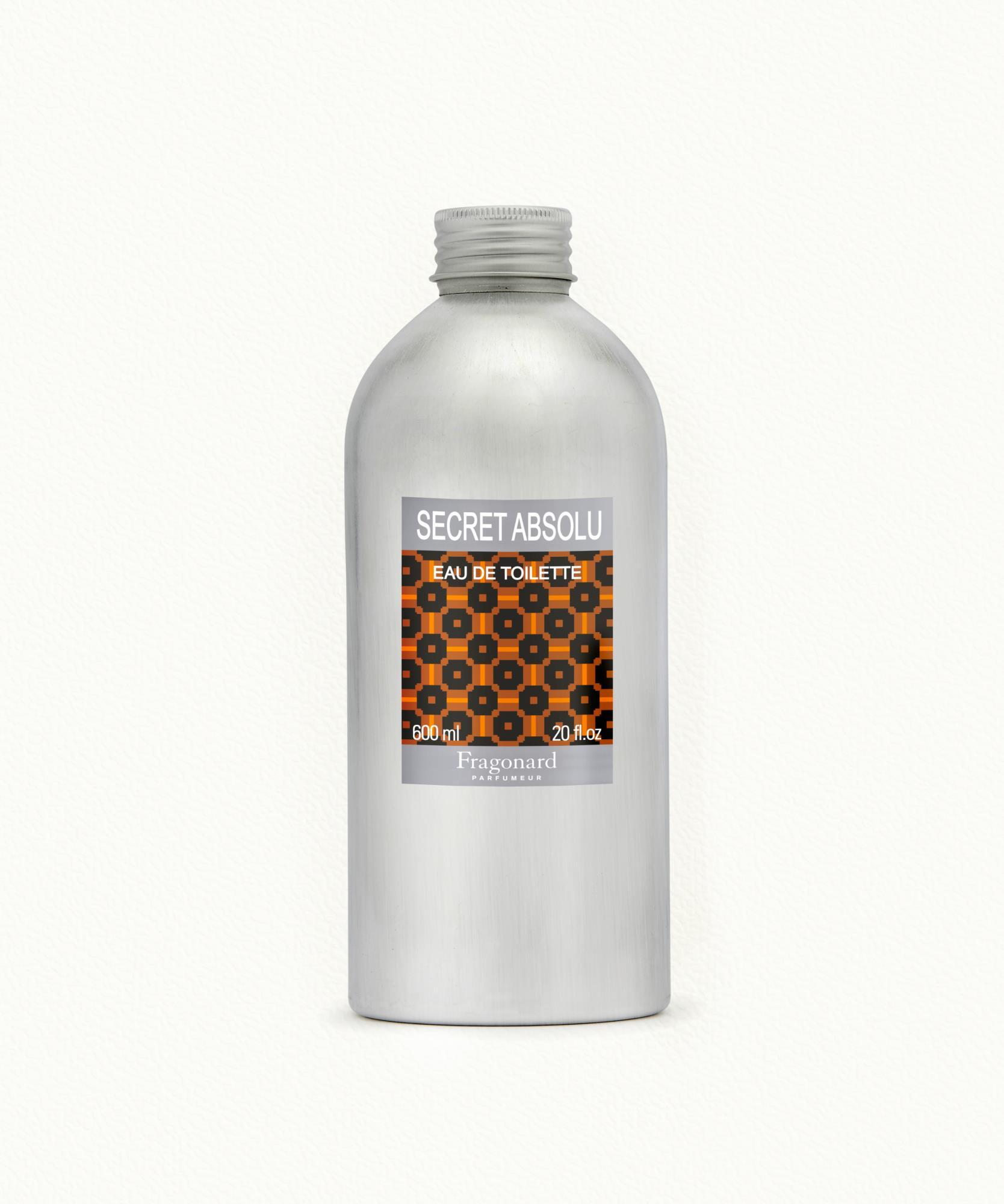 “Secret Absolu” eau de toilette in its refill can to fill the refillable spray bottle: the reminiscence of the oud scent from a trip to a faraway land, a memory of a spice market eternally lodged in our olfactory memory.... Secret Absolu emits an exotic, sophisticated, and virile aroma. Bergamot, cypress, and pepper in the head notes, cedar, white amber, and violet petals in the heart notes, all resting on a precious base of oud, leather, tonka bean, musk, with a dash of vetiver and patchouli.
