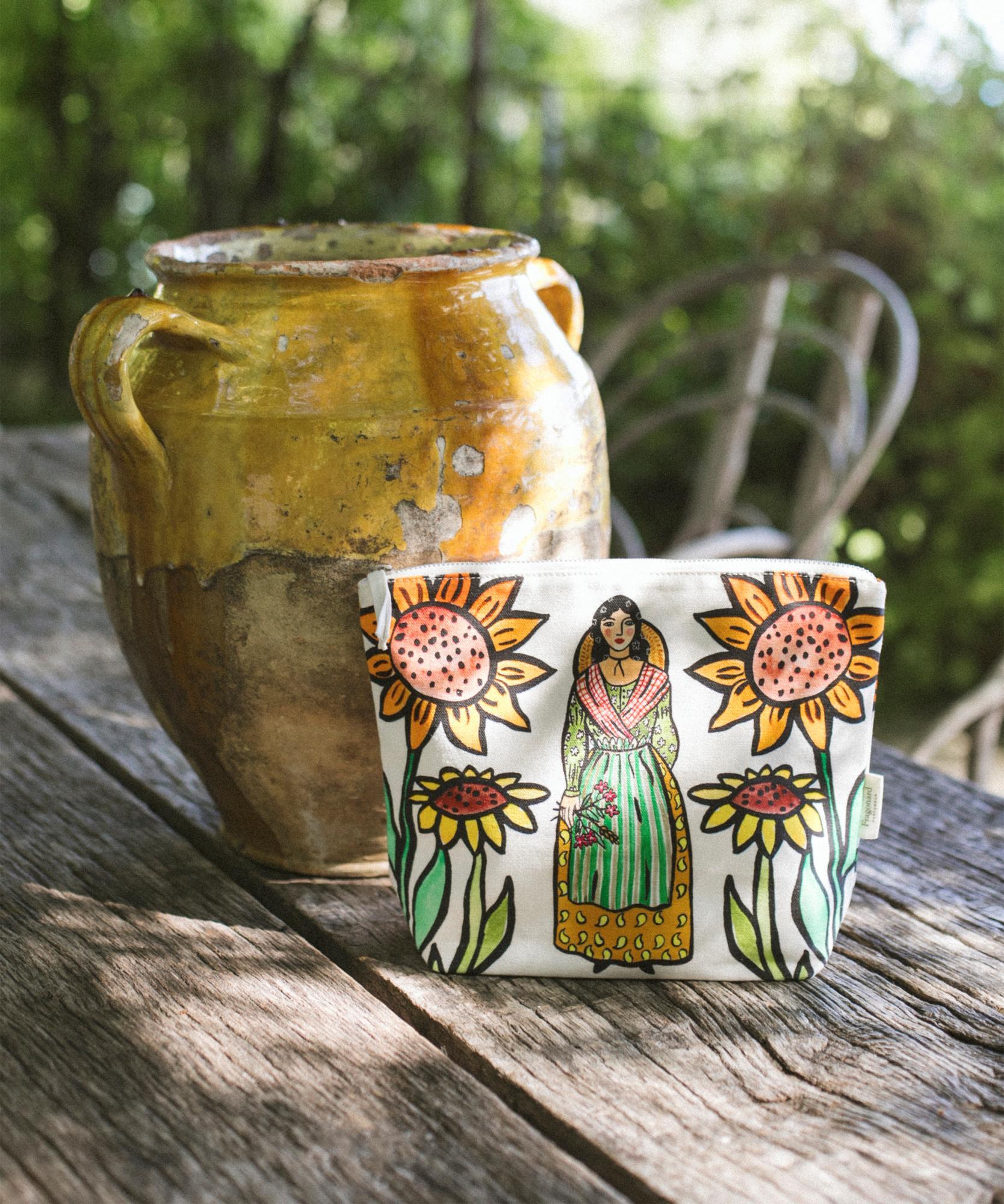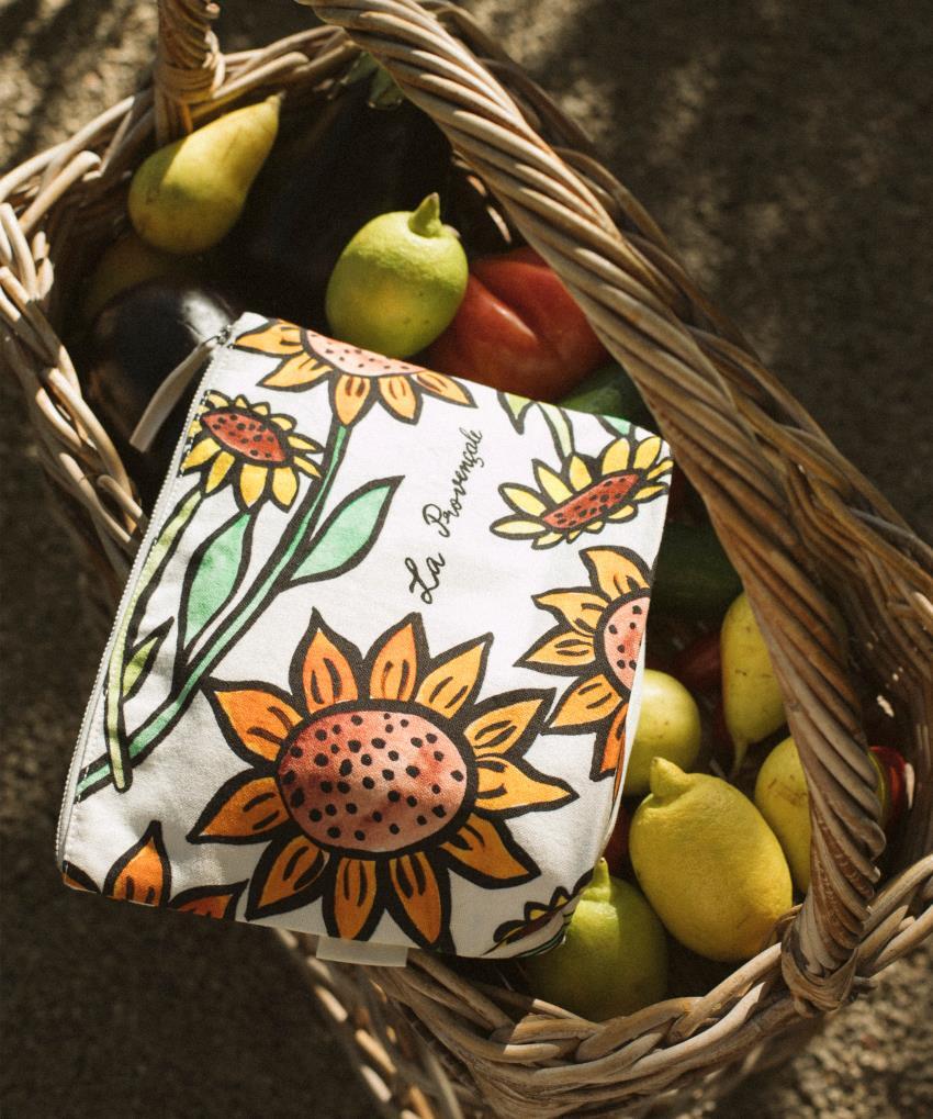 Tierra de luz y arte de vivir, la Provenza inspira a Fragonard con sus colores vibrantes y su autenticidad. Con sus girasoles vibrantes y su silueta femenina típica de la Provenza, esta bolsa celebra las raíces soleadas de nuestra Casa. Práctica y elegante, esta bolsa de algodón se desliza fácilmente en un bolso de mano o un shopper, perfecta para usted o como regalo.
