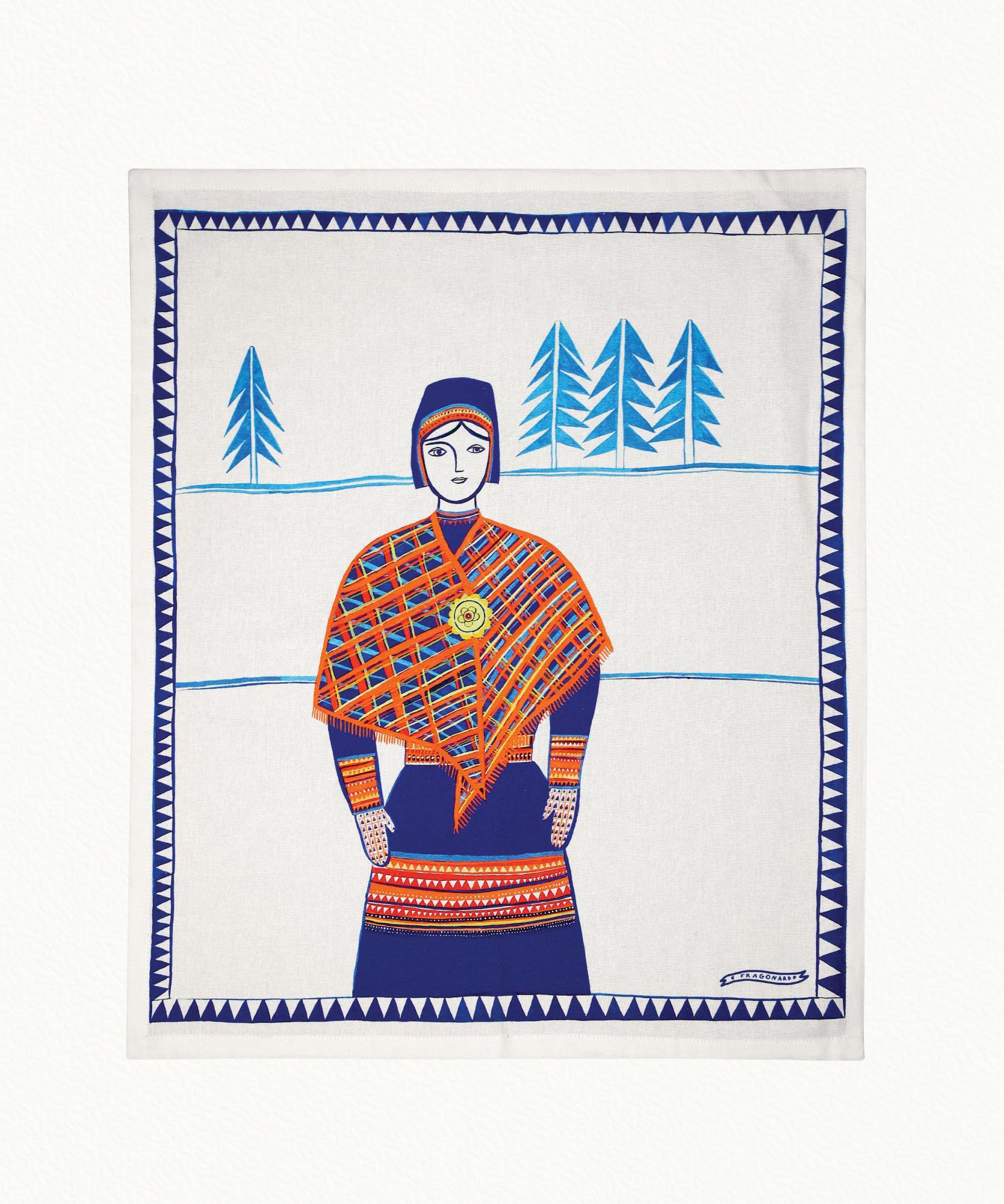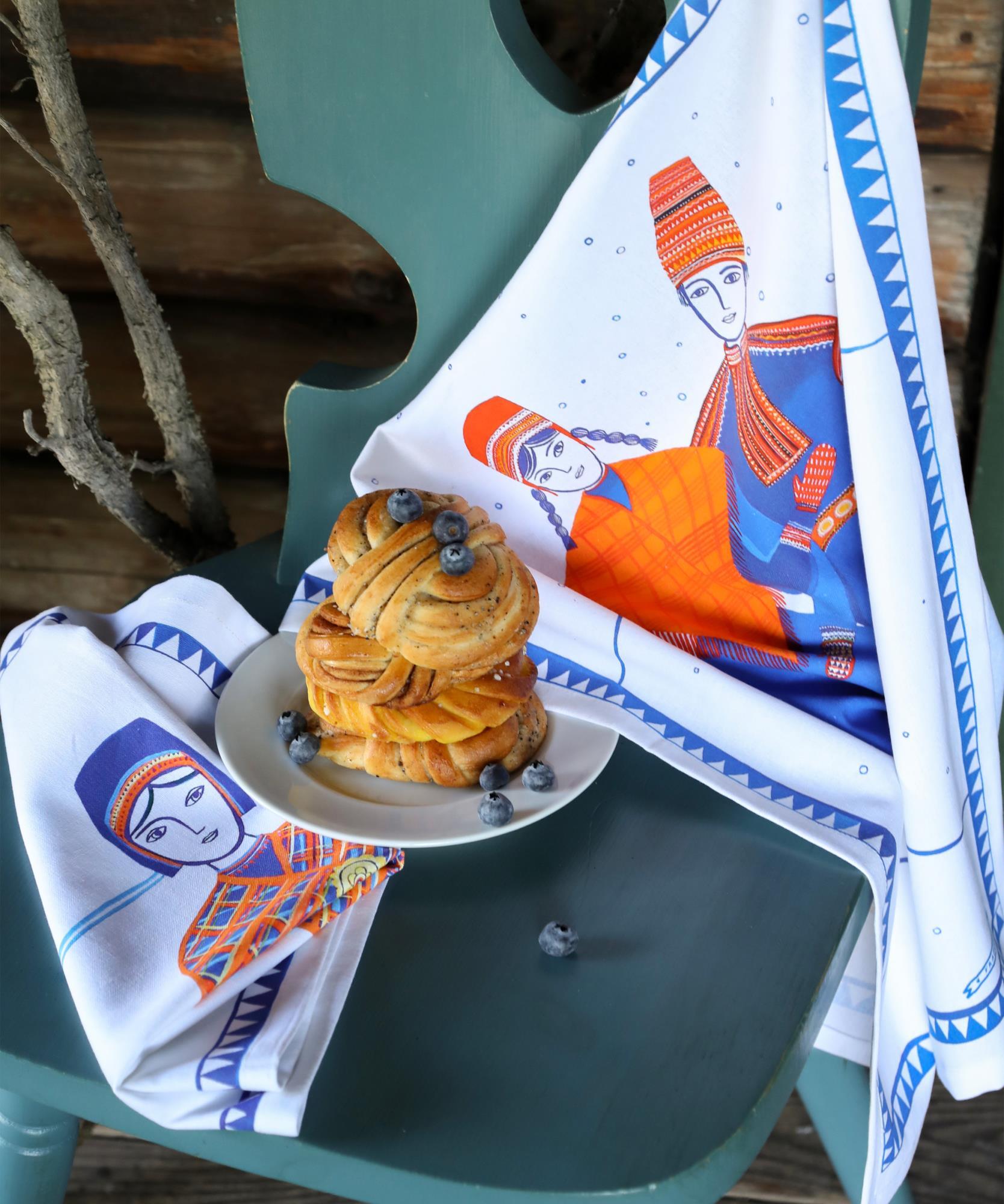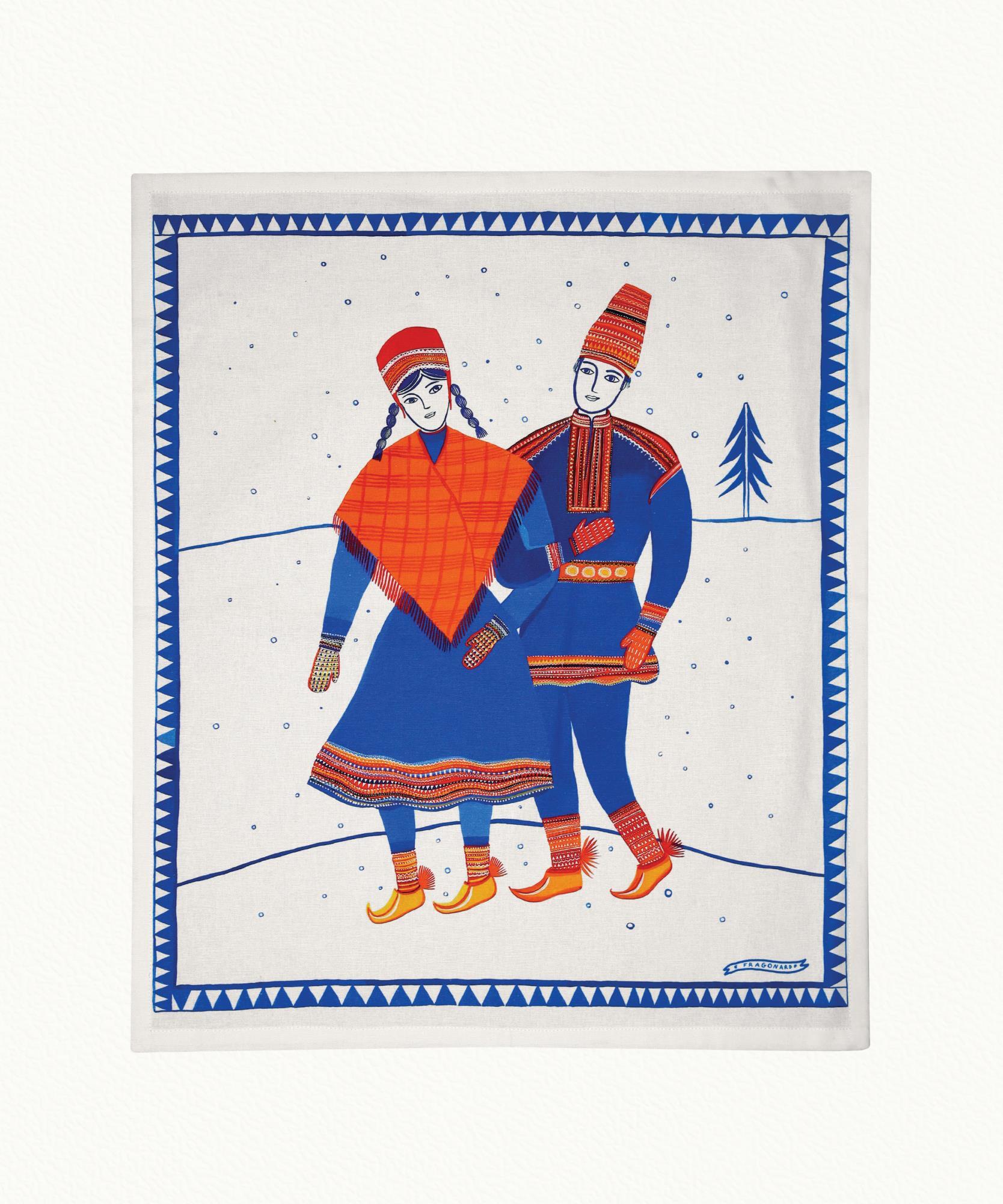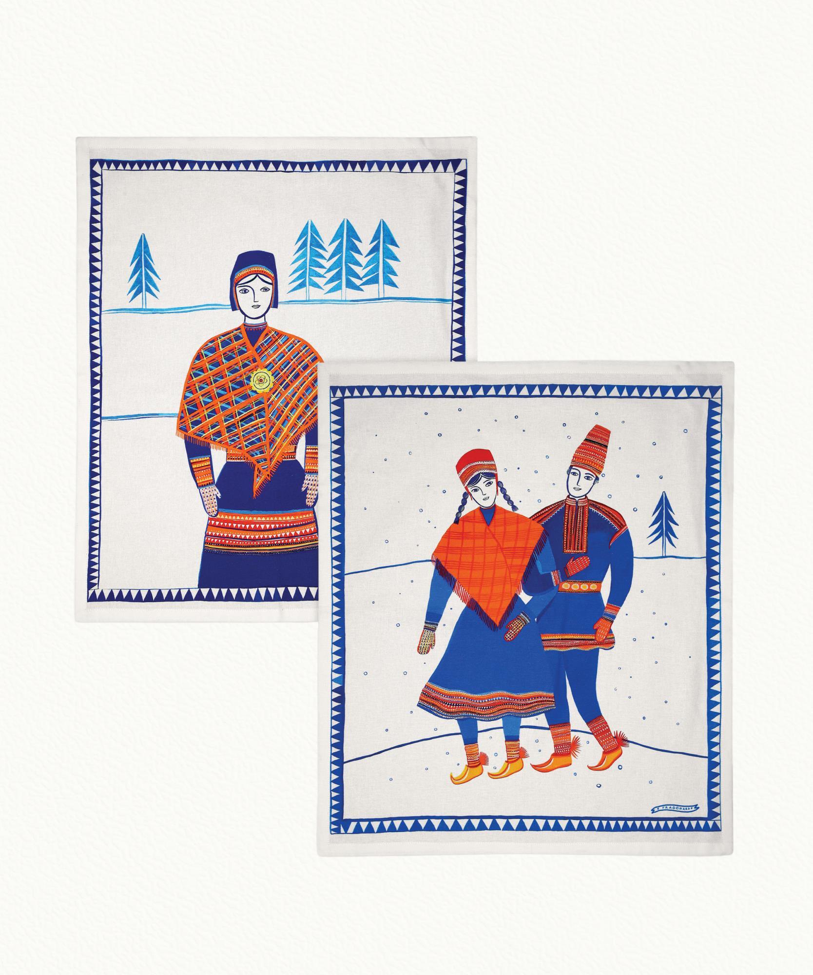 Cada temporada, nuestras colecciones de manteles y paños se diseñan como pequeños cuadros. En este caso, las ilustraciones de estos dos paños de algodón recuerdan más bien a las páginas de un cuento de Navidad. Dos escenas invernales están protagonizadas por personajes sami, un pueblo indígena de Laponia. No solo son maravillosos, sino también prácticos, gracias a su pequeño gancho incorporado.