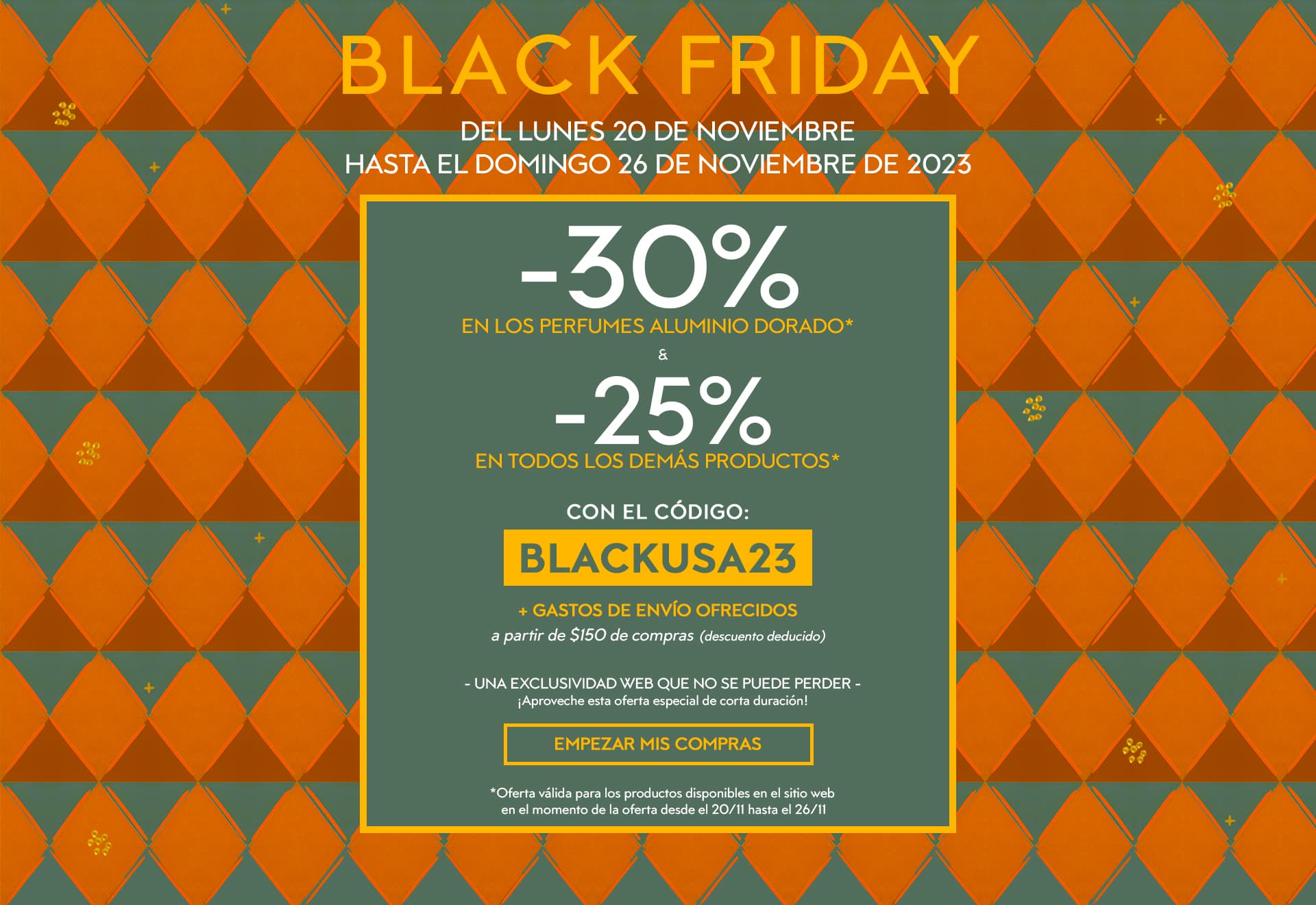 *Oferta válida del 20/11/2023 al 26/11/2023 en productos disponibles en el sitio web en el momento de la oferta. No se puede usar para compras en curso o realizadas antes del 20/11/23. Entraga gratuito en pedidos superiores a $150 después de descuentos. Válido solo para pedidos realizados en www.fragonard.com y solo con el código BLACKUSA23. En caso de agotamiento de existencias de regalos, recibirá regalos de un valor equivalente o superior. Oferta válida para entregas solo en los Estados Unidos, excluyendo Hawái, Puerto Rico y Alaska. No se pueden recibir regalos de dos pedidos o boletines diferentes para el mismo pedido. No válido en nuestras fábricas y tiendas. Oferta personal, no transferible, no transmisible y válida solo una vez. La oferta es válida para pedidos enviados a los Estados Unidos y realizados solo en línea, sujeta a la disponibilidad de existencias. Todas las compras están sujetas a autorización bancaria antes de ser procesadas. Solo se procesarán y enviarán las compras autorizadas. No válido para pedidos ya validados, enviados o en proceso de preparación. No válido para la compra de una tarjeta de regalo electrónica. La compra de una tarjeta de regalo electrónica no forma parte del programa de fidelidad de Fragonard y no otorga puntos de fidelidad. Una tarjeta de regalo electrónica comprada en dólares no se puede enviar fuera de los Estados Unidos y solo es válida en el sitio dedicado a los Estados Unidos. Envíenos un correo electrónico a la siguiente dirección: fragonard.usa@fragonard.com Por correo: Servicio al Cliente de Fragonard - BP 34240 - 06131 GRASSE Cedex 1 Francia Tel: 0033 (0) 4 92 42 34 34 Sus datos son objeto de un tratamiento destinado a los servicios pertinentes de Parfums Fragonard Inc. en los Estados Unidos. Sus datos se recopilan para permitir el envío de nuestras novedades por correo electrónico. Se conservarán como máximo 3 años después de su última respuesta a nuestras solicitudes. La base legal de este tratamiento es su consentimiento, que puede retirar en cualquier momento, sin que ello afecte a la legalidad del tratamiento realizado antes de tal retiro. De acuerdo con el Reglamento General de Protección de Datos n.º 2016/679 del 27 de abril de 2016, tiene derecho a solicitar a Parfumeries Fragonard el acceso, la rectificación, la portabilidad y/o el borrado de sus datos personales, así como a limitar el tratamiento de los mismos y oponerse a su tratamiento. También tiene derecho a presentar una queja ante la CNIL en la dirección https://www.cnil.fr/. Para ejercer sus derechos ante Fragonard Inc, escriba a Fragonard Inc - 26 Richboyton Road Dover, NJ 07801 USA o envíe un correo electrónico a privacy@fragonard.com.