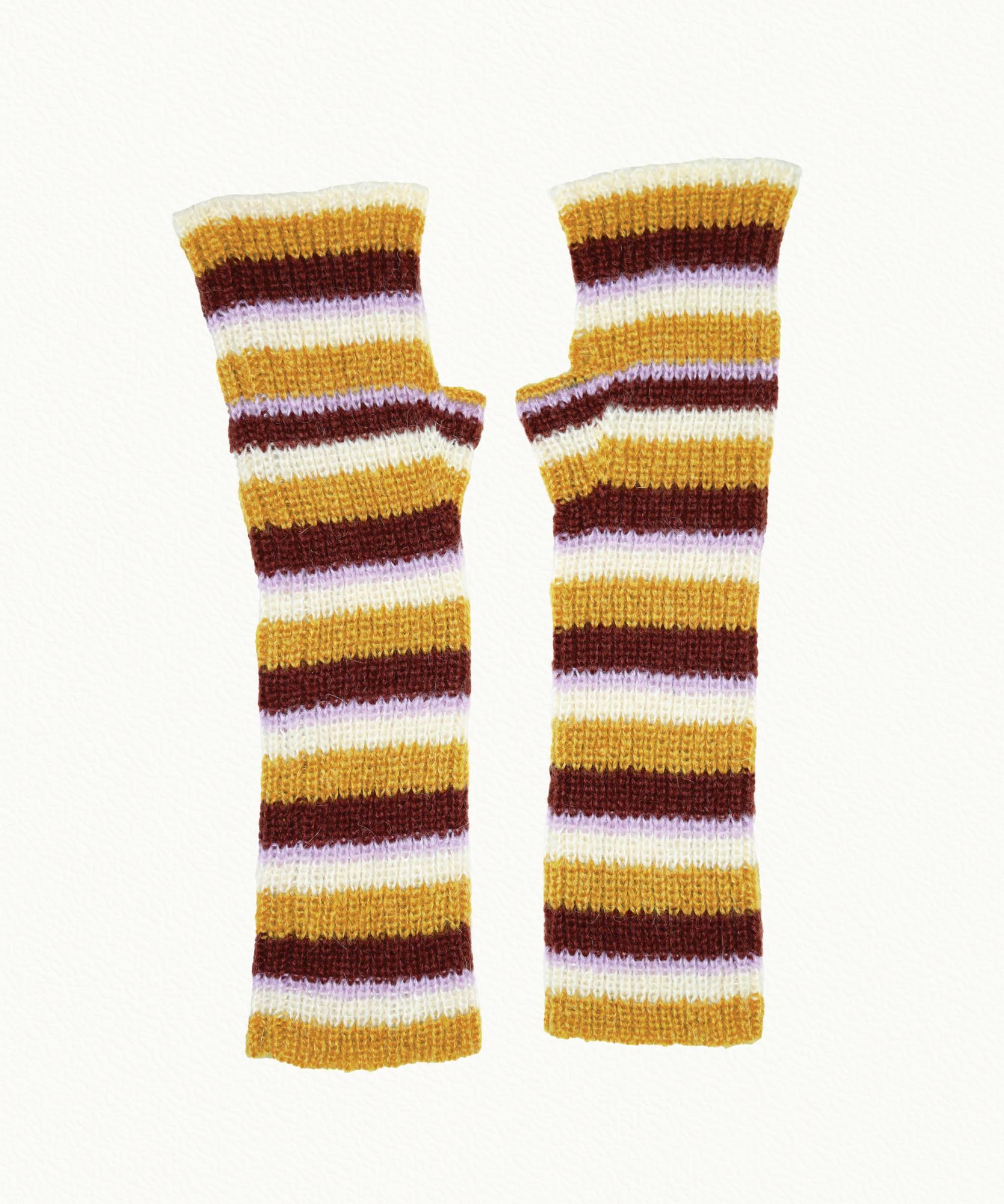 Protégez vos mains du froid avec style grâce à cette paire de mitaines rayées aux teintes joyeuses. Safran lumineux, bordeaux profond, blanc cassé et touches de violet s'associent dans une maille douce et chaude. Pratiques et confortables, ces mitaines laissent les doigts libres tout en gardant poignets et avant-bras bien au chaud. À porter en duo avec le bonnet rayé Kimi assorti pour une allure graphique et colorée.