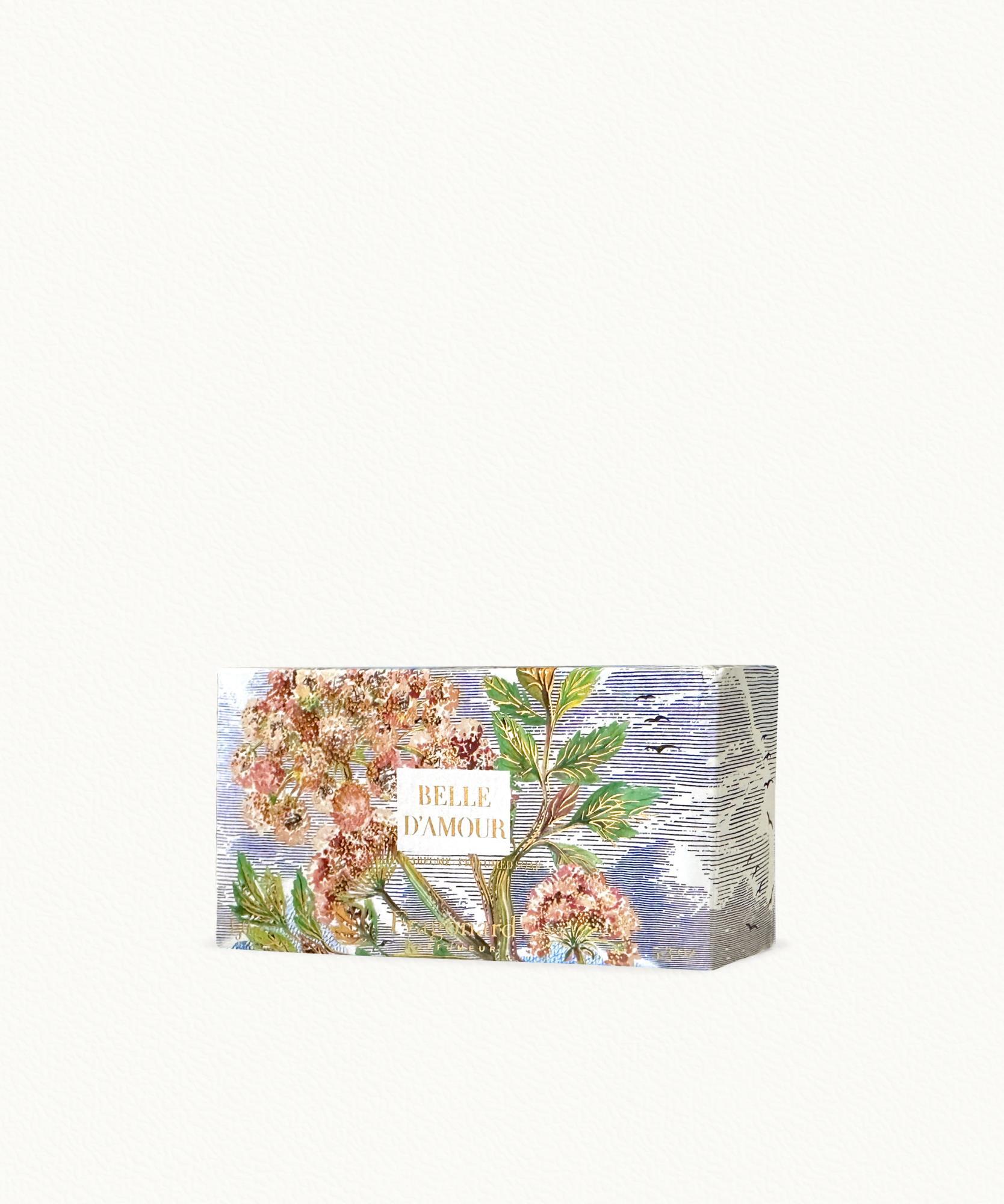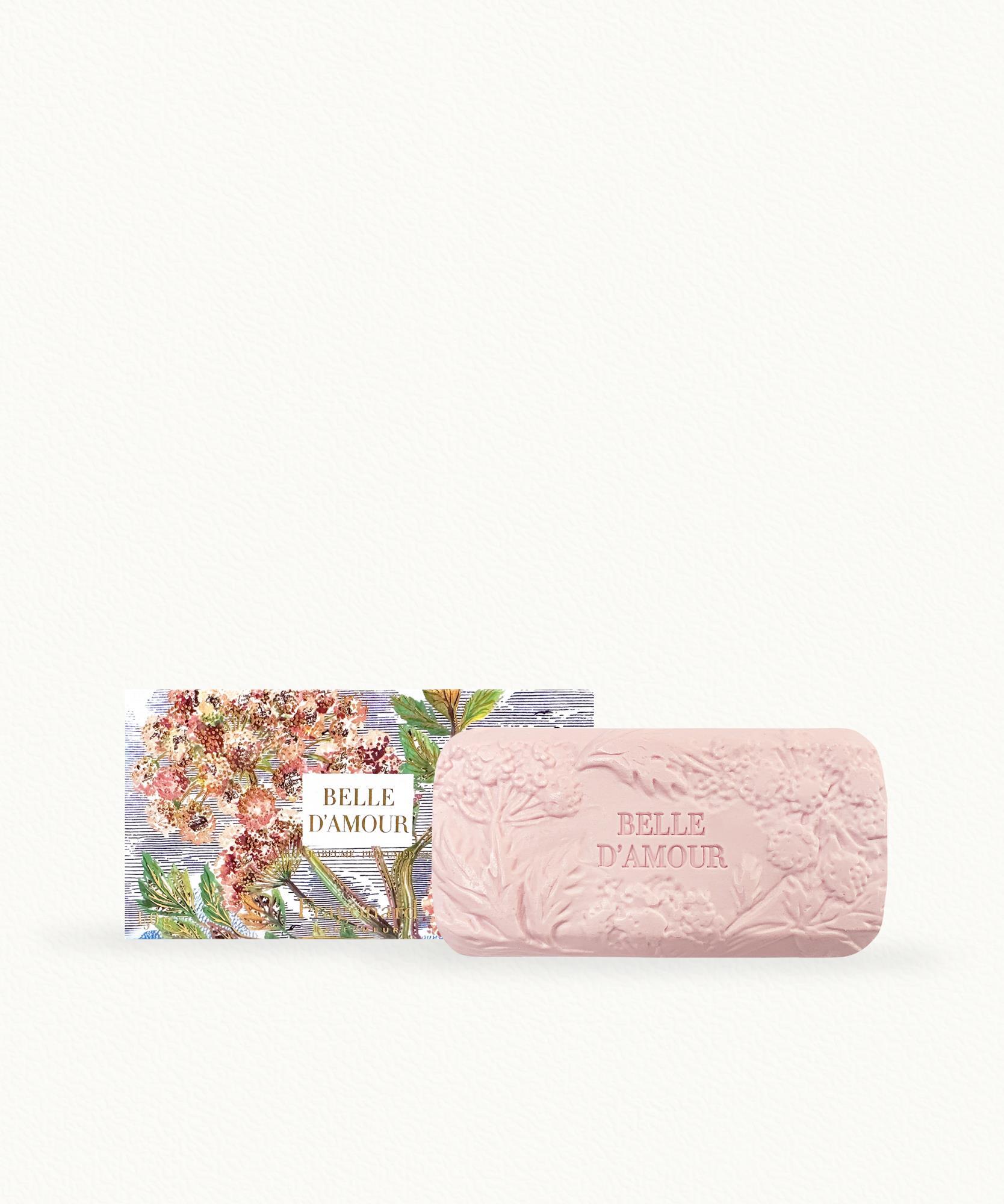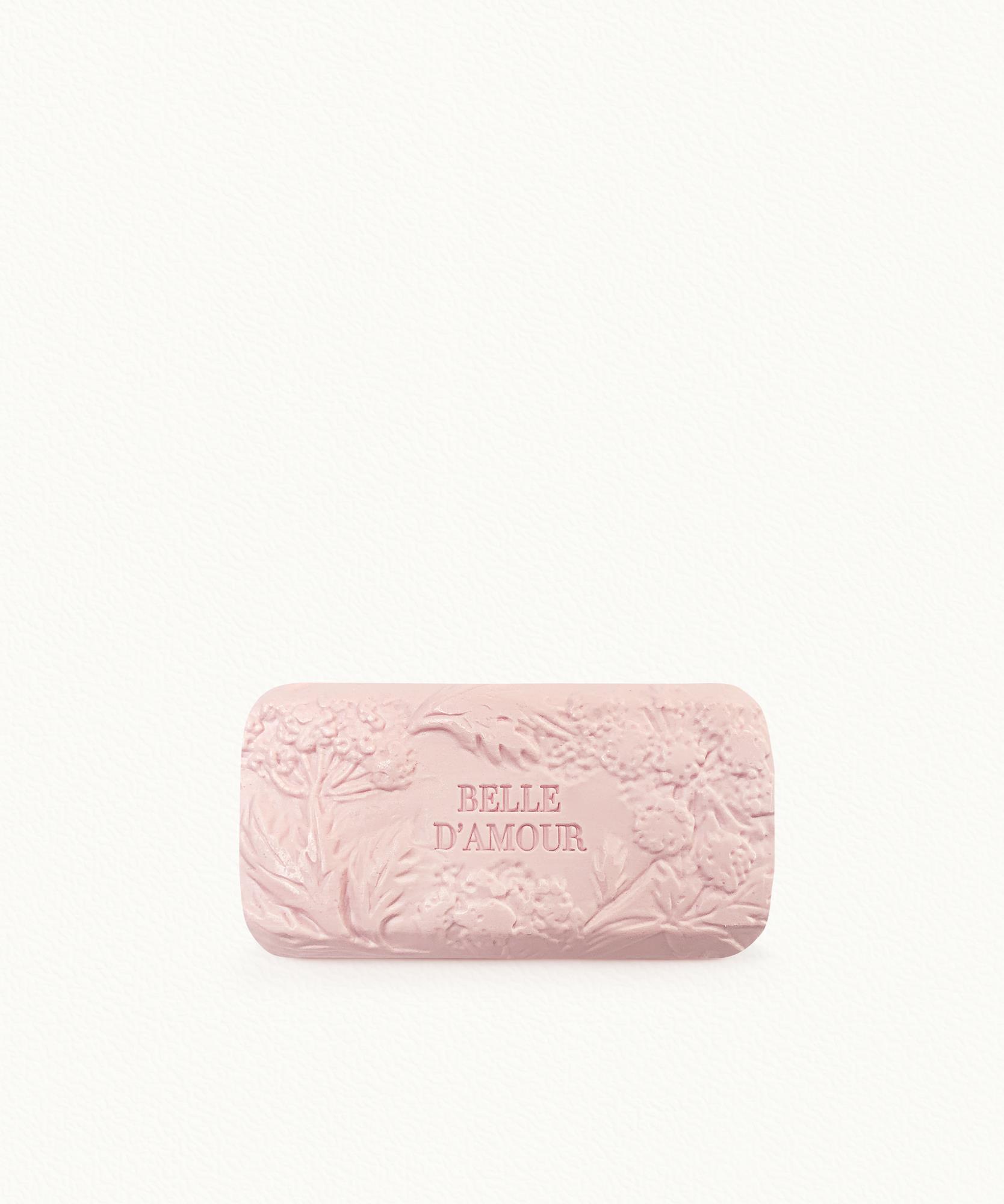 Produit de beauté autant qu'objet de décoration, cet élégant savon parfumé est gravé de fleurs d'angélique, reine de la gamme Belle d'Amour. Le sillage floral et gourmand de ce savon parfume délicatement les mains tout en les laissant parfaitement nettoyées. Son format généreux vous assure de profiter durablement du parfum suave de ce joli savon parfumé à la robe rosée.