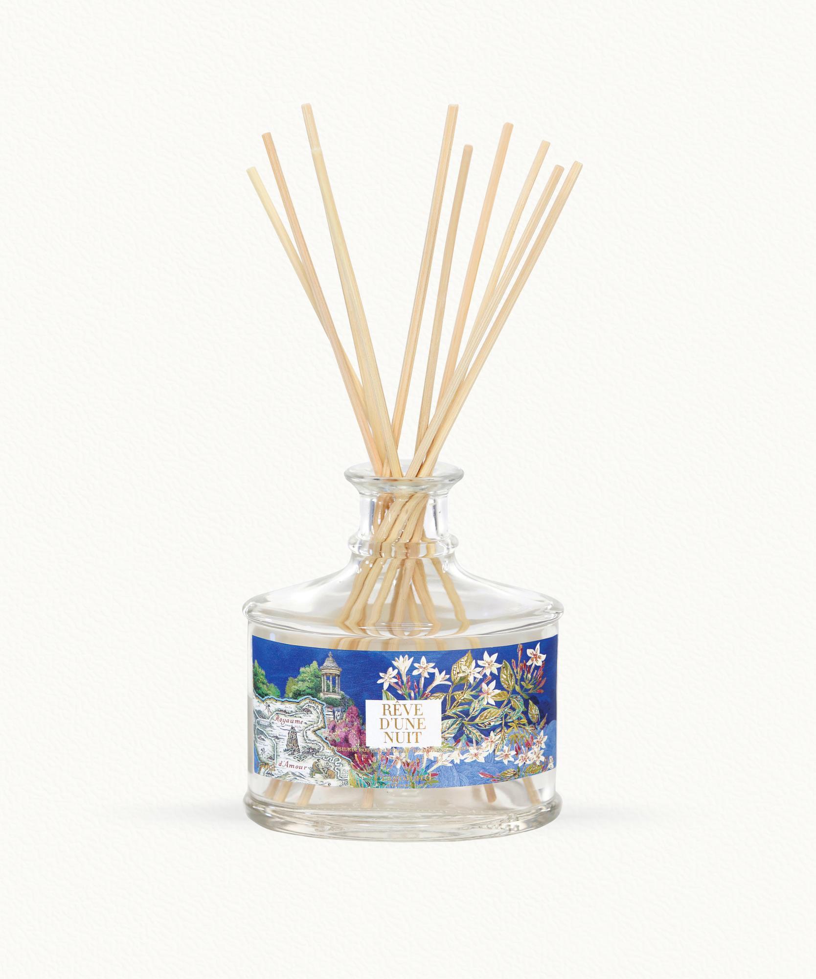 Dernier né de nos créations parfumées pour la maison, le diffuseur d'intérieur Rêve d'une Nuit met en flacon l'impression de la tombée du jour sur un jardin méditerranéen. Au fil des heures se diffusent dans la pièce les effluves suaves du jasmin conjugués aux douces notes capiteuses de l'ambre et du bois de cèdre. Objet de décoration et d'un plaisir sensoriel renouvelé, ce diffuseur s'accompagne de ses bâtonnets de rotin.