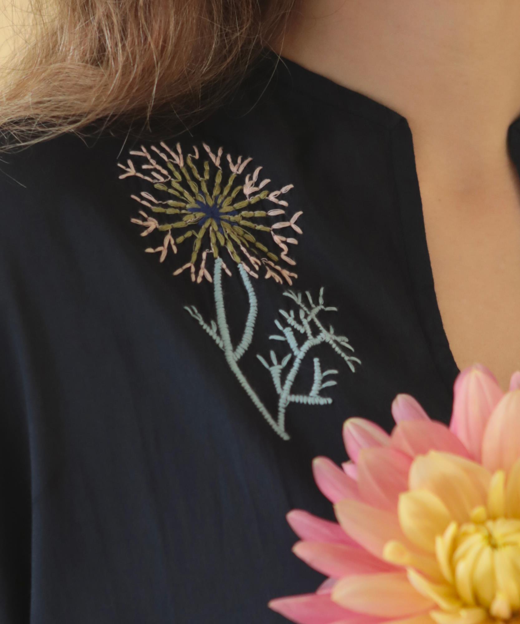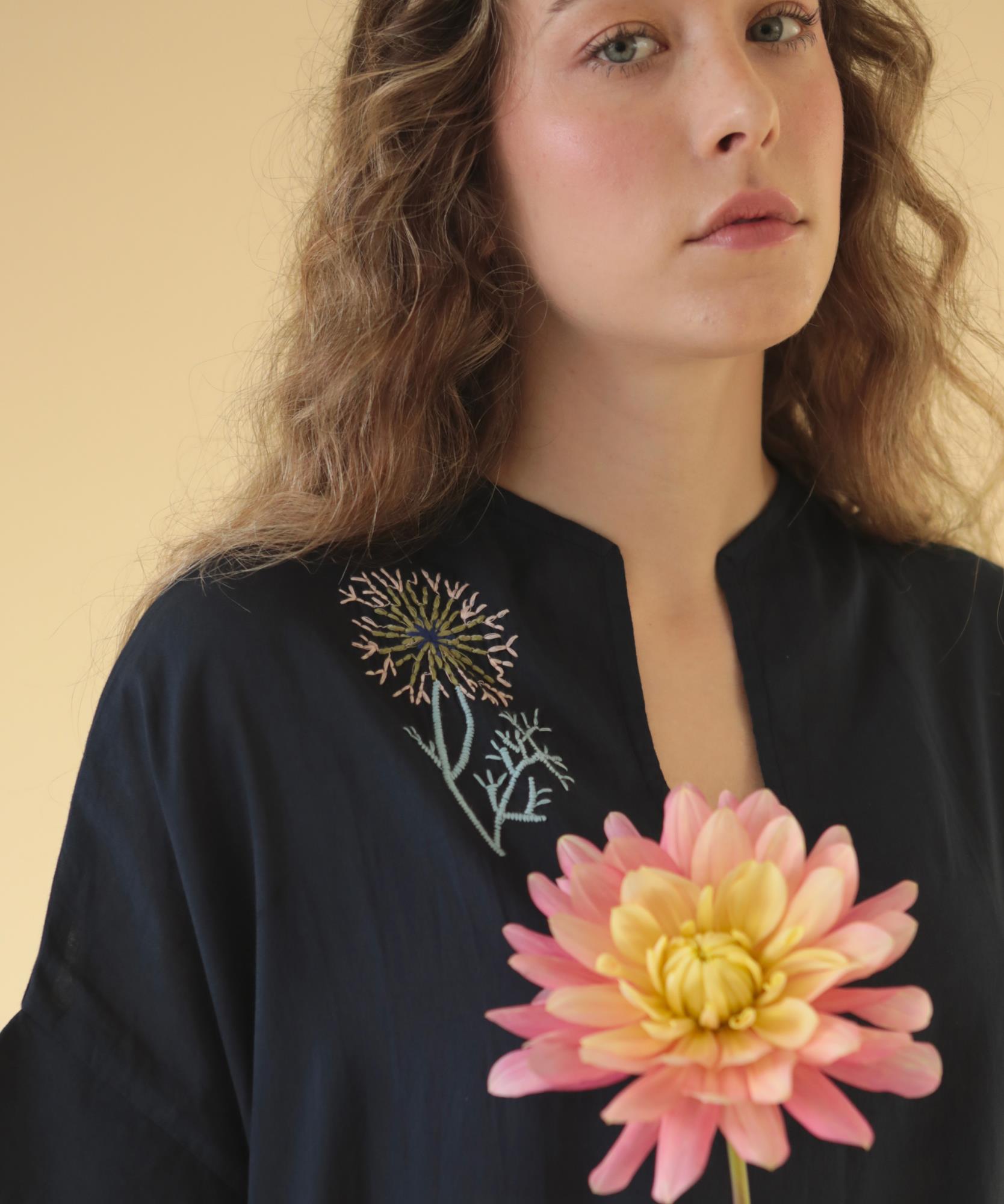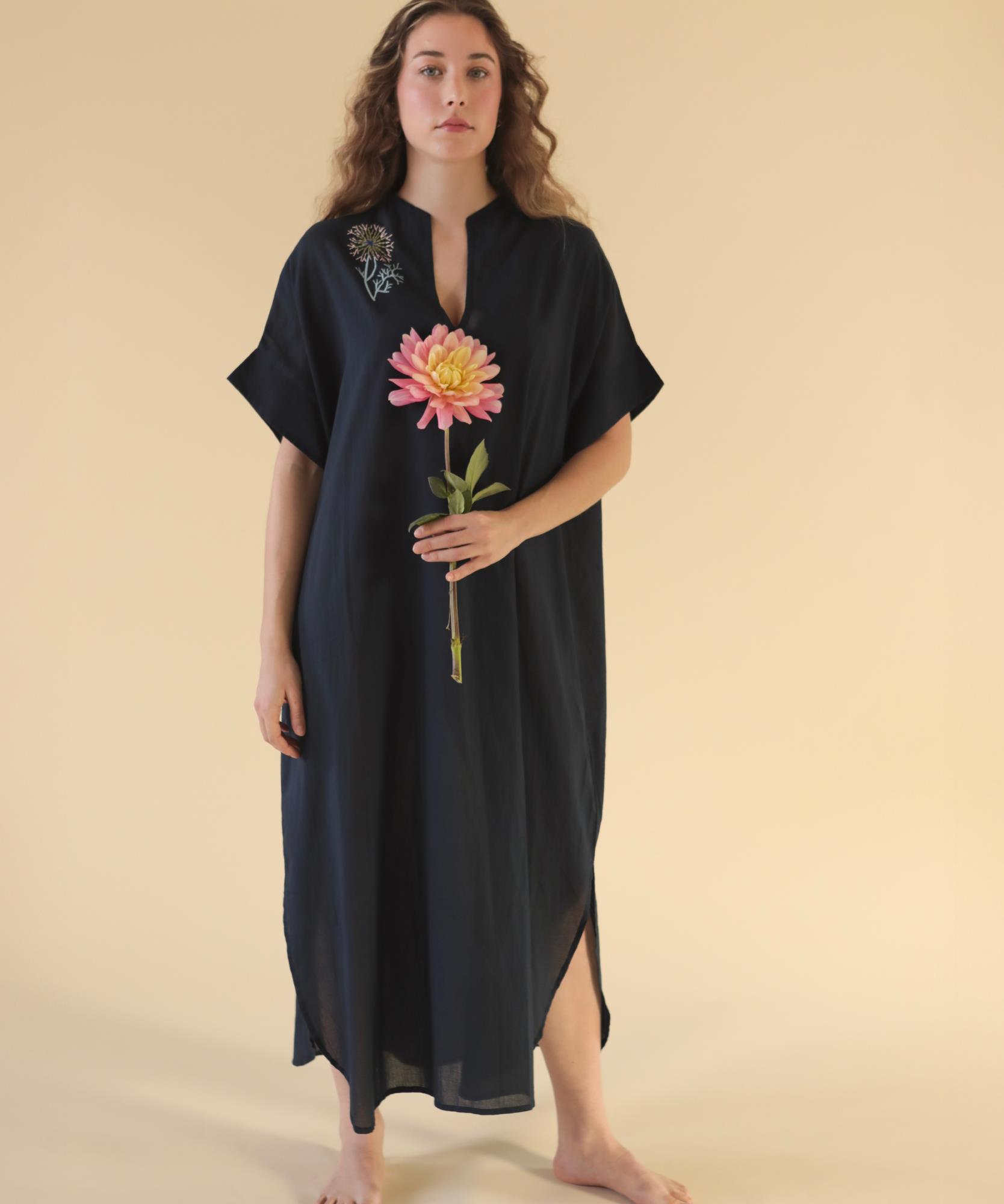 Nella sua versione blu navy, questo lungo caftano in cotone esprime un’eleganza morbida e moderna. Il cotone leggero scivola delicatamente sulla silhouette, mentre lo scollo a V ricamato con un fiore stilizzato illumina questo capo estivo. Maniche corte, spacchi discreti e la linea ampia lo rendono comodo da indossare dalla mattina alla sera, sia in casa che all’esterno. Questo abito caftano in taglia unica è disponibile anche in un sontuoso colore rosa.