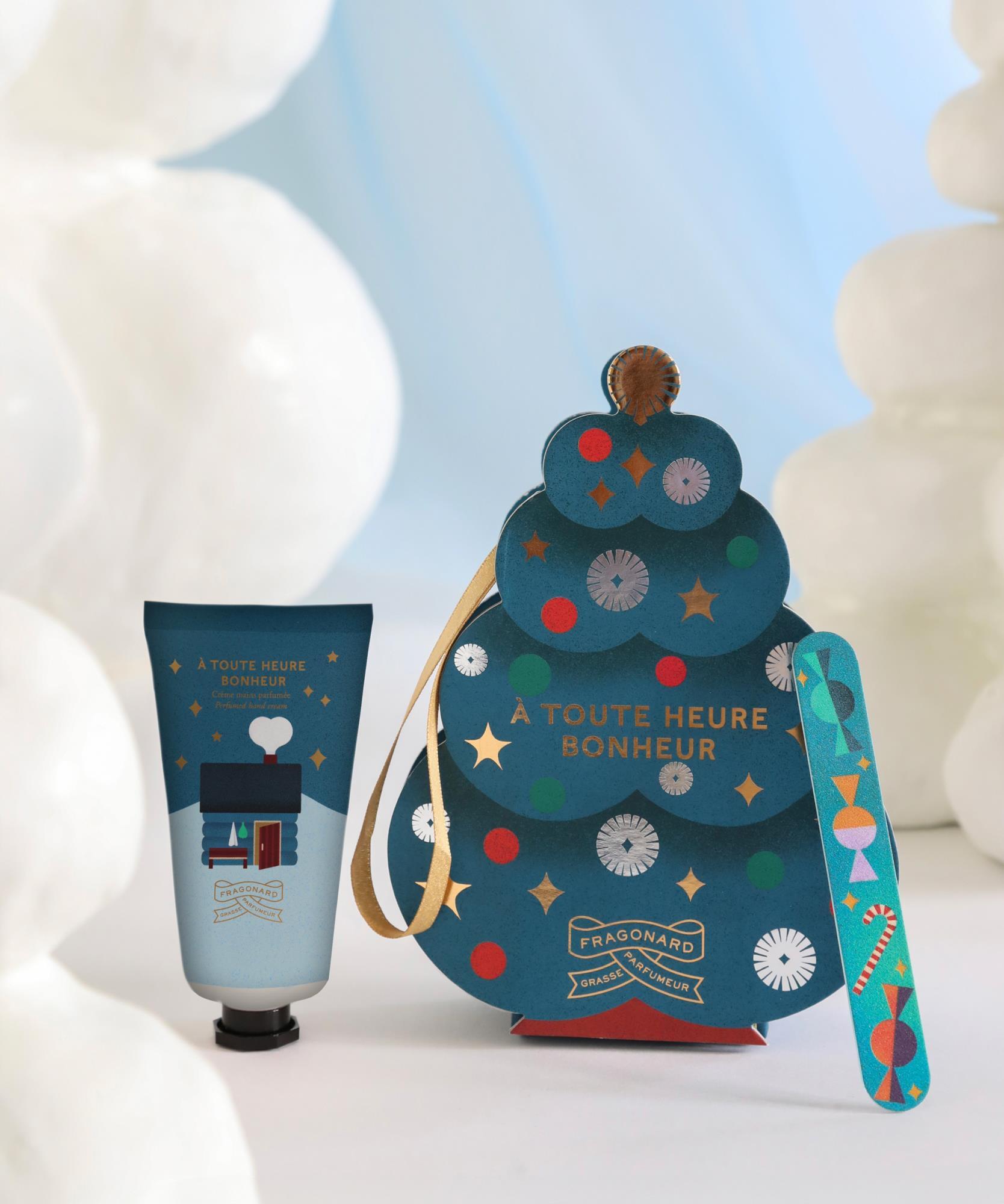 Appesa all’albero di Natale, questa graziosa scatola a forma di albero nasconde una crema mani profumata con Eau du Bonheur e una lima per unghie con un piccolo specchio. Un delicato tesoro da regalare… o da custodire per sé.