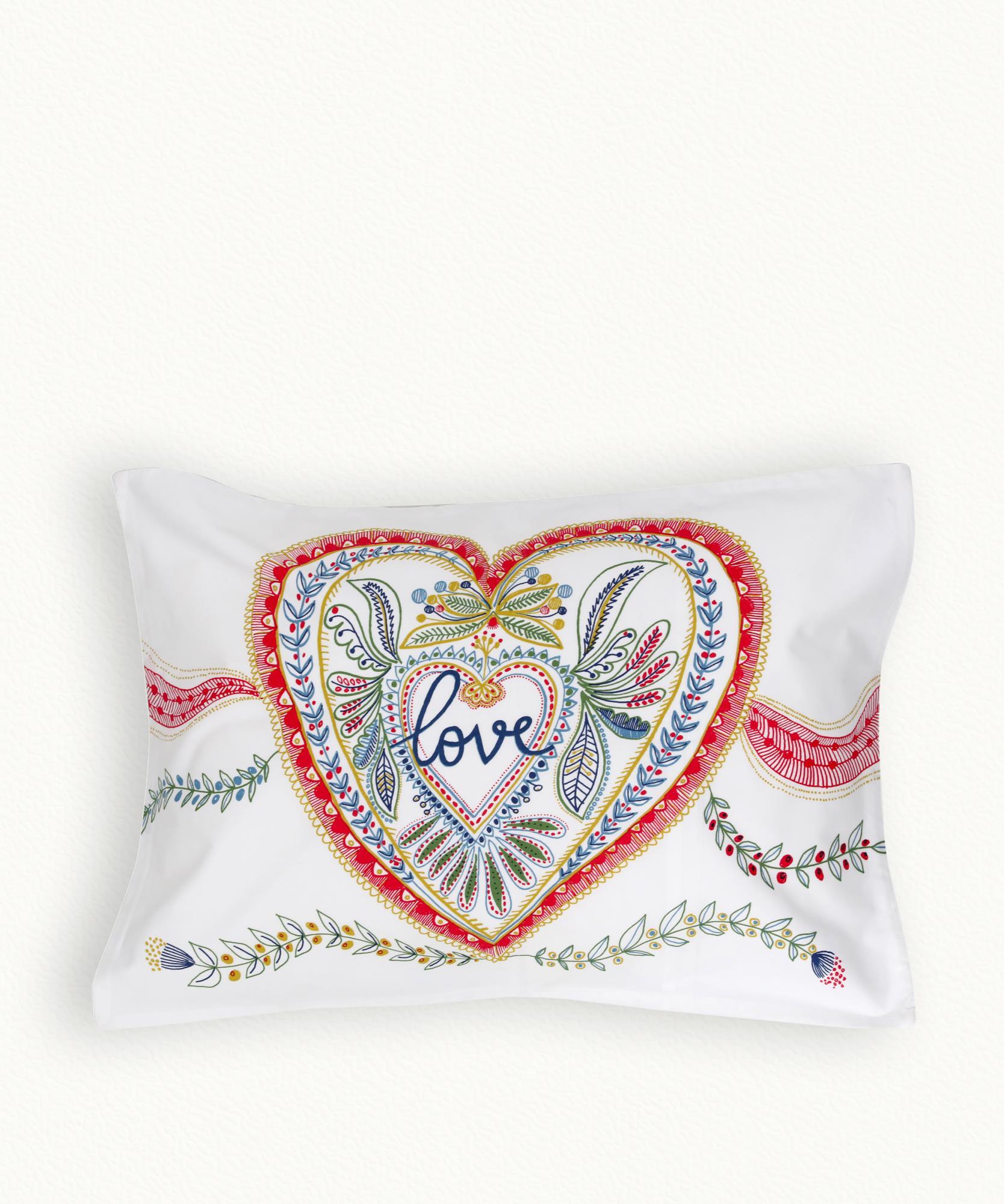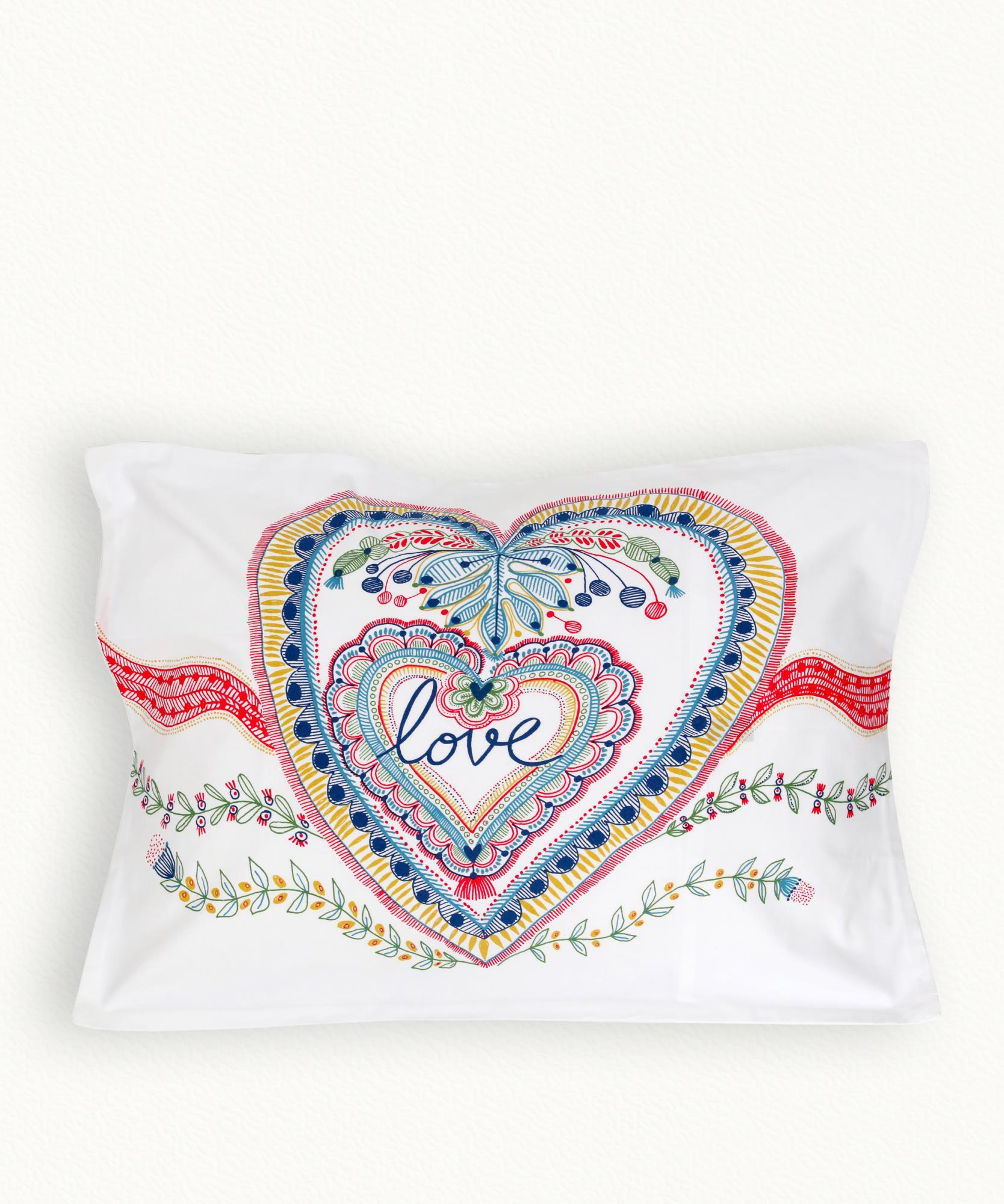 Duo di cuori per un set da letto romantico. Set di due federe di cuscino in cotone stampato.