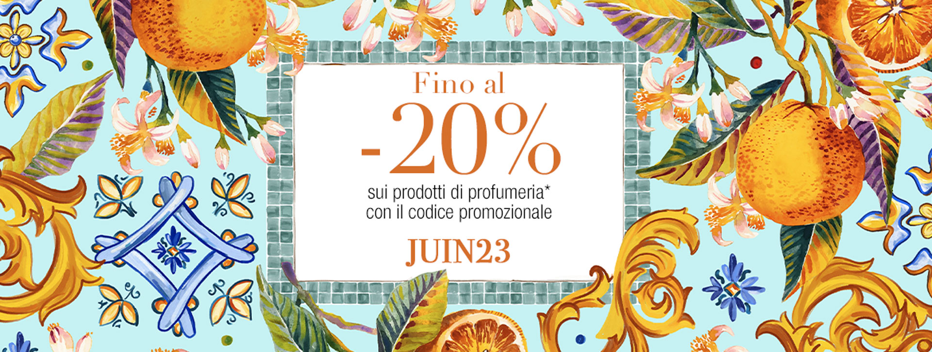 *Offerta valida per gli ordini effettuati su www.fragonard.com dal 01/06/2023 al 30/06/2023 nei limiti degli stock disponibili e solamente con il codice JUIN23. Valida unicamente per una spedizione standard in Italia. Non valide nelle nostre fabbriche e negozi. **5% di sconto lattina ricarica, su gel doccia e latti corpo, balsamo dopobarba, saponi, portasapone e cofanetti sapone (sapone + portasapone). 10% di scontosu eaux de toilette (50, 100 e 200 ml), eaux de parfum (50 ml), candele e diffusori, cosmetici e sapone della linea "Vrai", cure essenziali e profumo di casa. 20% di sconto sui profumi flacone spray alluminio dorato (15, 30, 60 e 120 ml). Non si applica per il laboratorio di profumo e attività. Non cumulabili con un'altra offerta regalo o promozionale. Non si possono avere per lo stesso ordine i regali di due ordini o di due newsletter differenti. Offerte personali, non cedibili, non trasmissibili e valide una sola volta. Non valide per gli ordini già validati, spediti o in corso di preparazione. Valide per ogni cliente iscritto nello schedario della vendita a distanza prima del 31/05/2023.