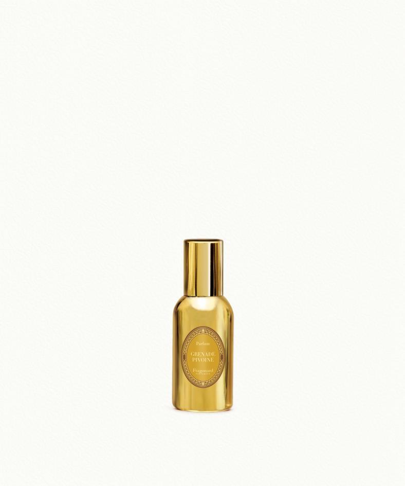 Grenade - Pivoine (Melograno- Peonia) Fruttata in testa di melograno e di pera, fiorita nel cuore di peonia e assoluto di rosa, legnoso nel fondo di cedro e di quercia: il profumo Grenade Pivoine, nella sua graziosa boccetta di alluminio dorato, invita alla fuga.